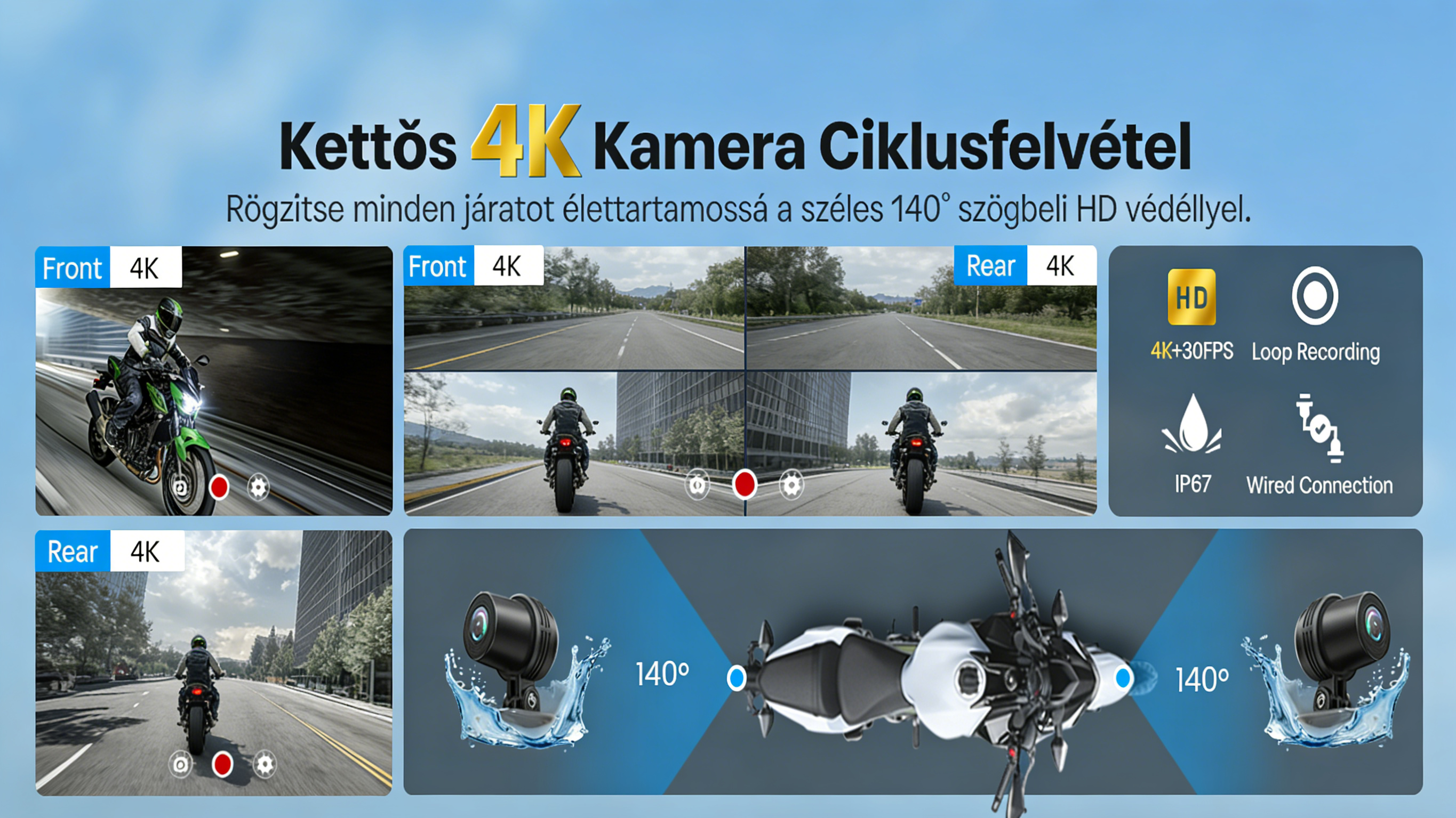 • Első és hátsó kamera szinkron rögzítése,140° széles látószögű HD kép